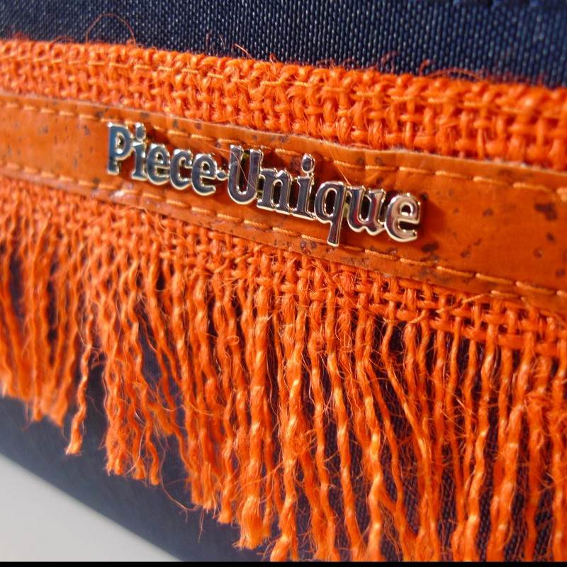Liege luxe orange et du coton jambo (hors collection), ainsi que de la Beach star marine, suédine Alaska orange et une petite touche de jute orange sur le devant qui forme des franges.