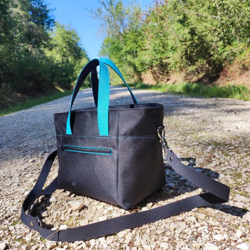 L'extérieur est lavable à l'éponge et facile à vivre dans la toile à sac noir et turquoise.
