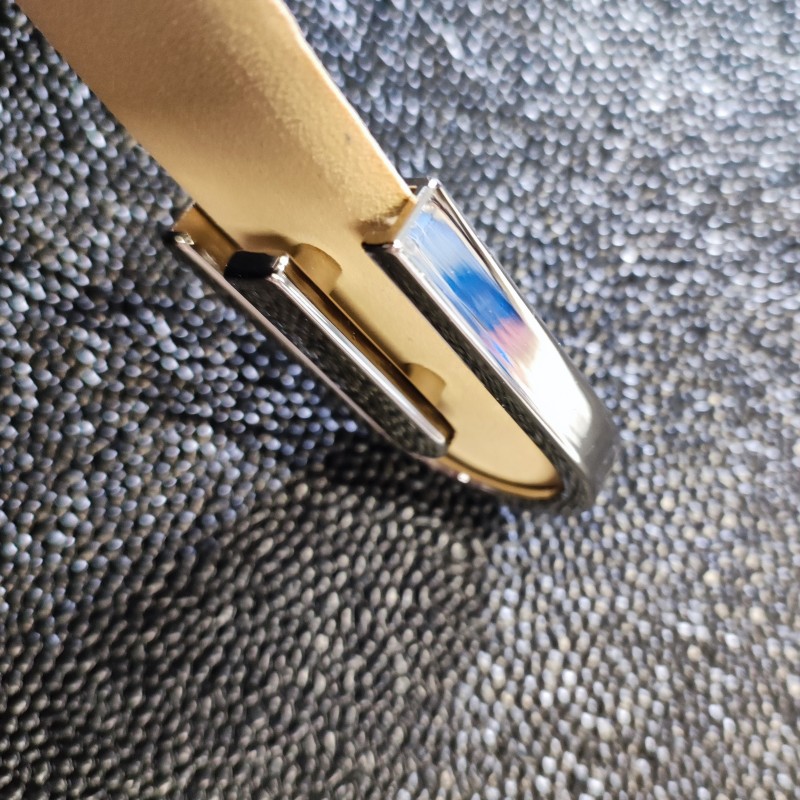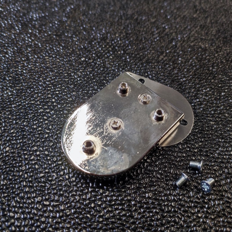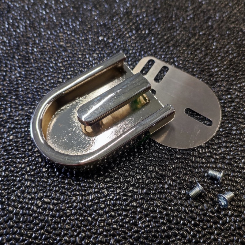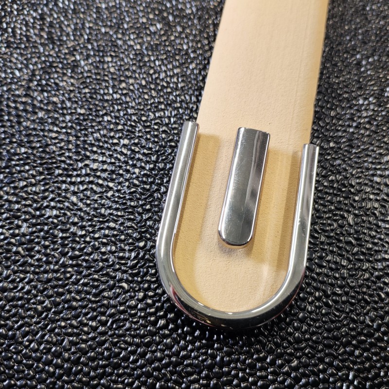 2- Coupez votre extrémité de sangle avec ce gabarit. Insérez votre sangle dans cet emplacement et vissez au dos les 2 vis centrales