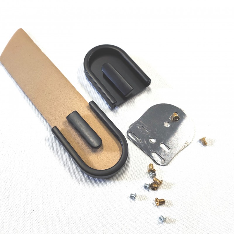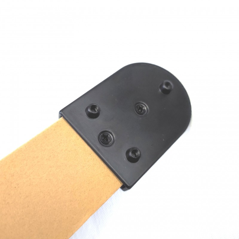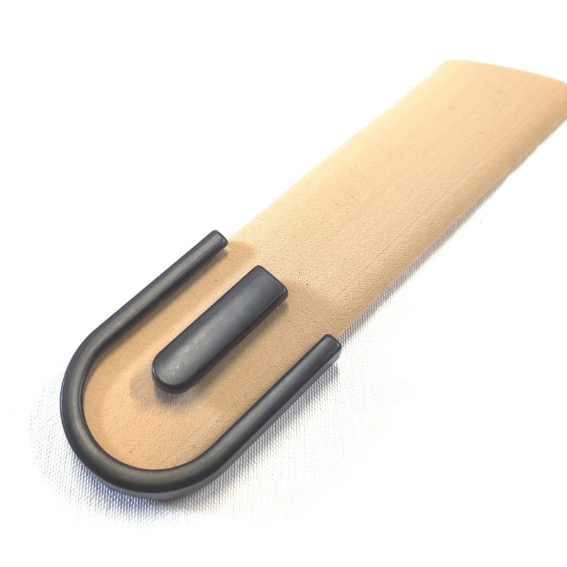 2- Coupez votre extrémité de sangle avec ce gabarit. Insérez votre sangle dans cet emplacement et vissez au dos les 2 vis centrales