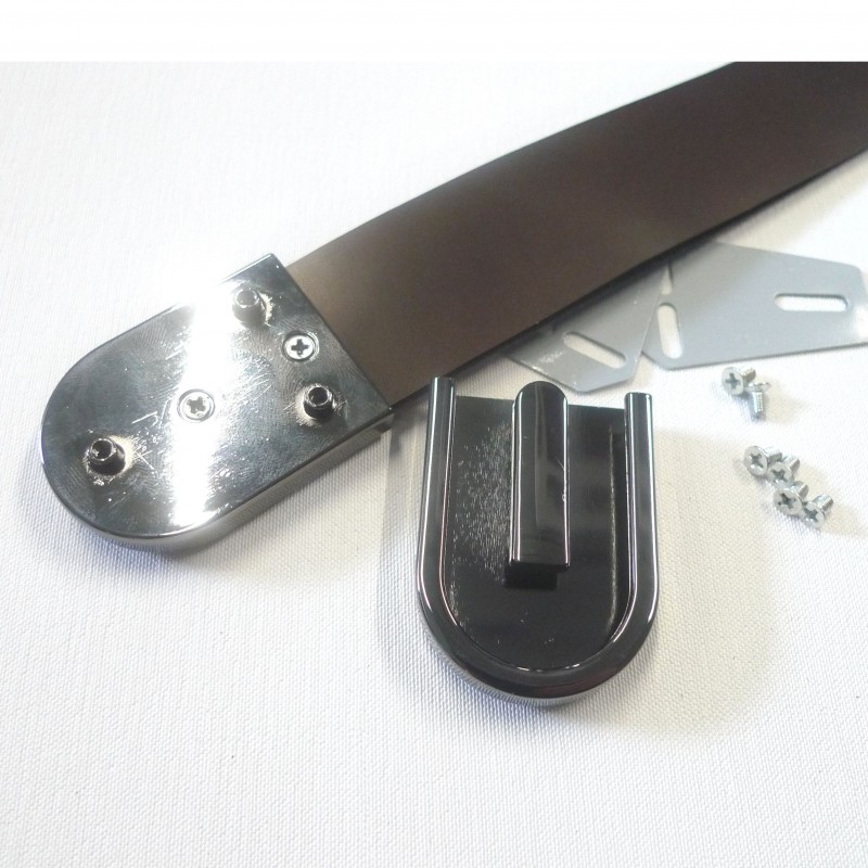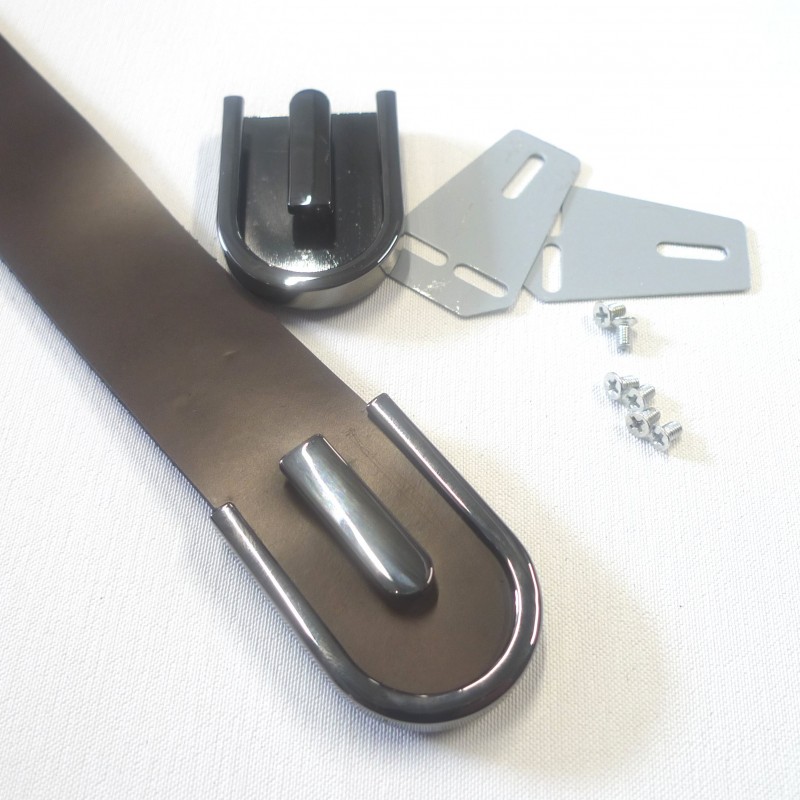 2- Coupez votre extrémité de sangle avec ce gabarit. Insérez votre sangle dans cet emplacement et vissez au dos les 2 vis centrales