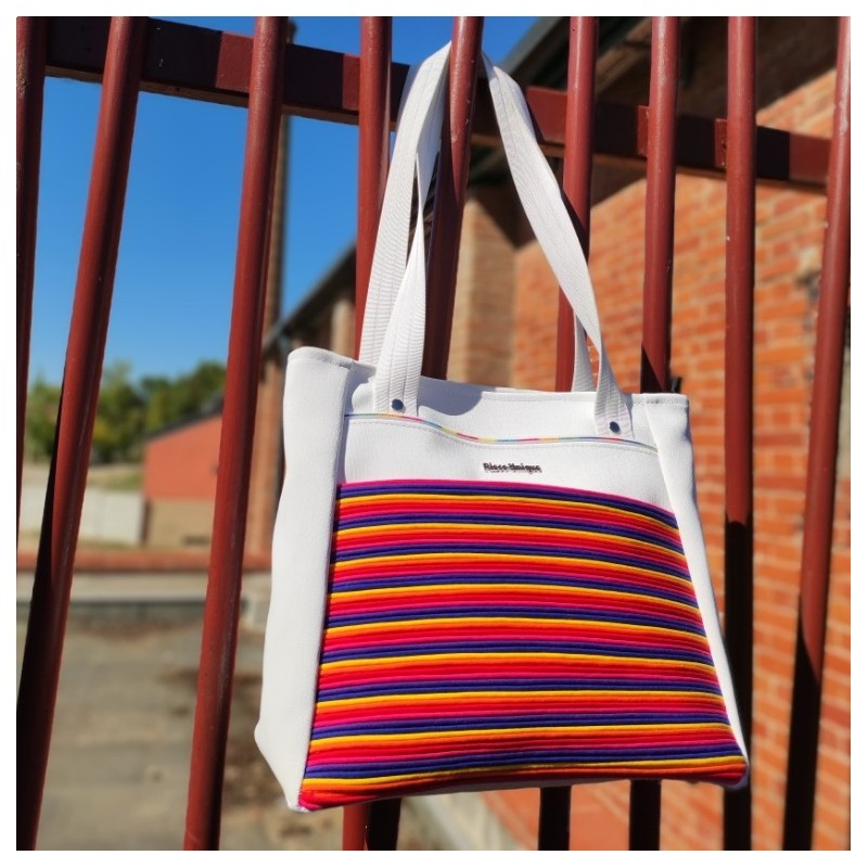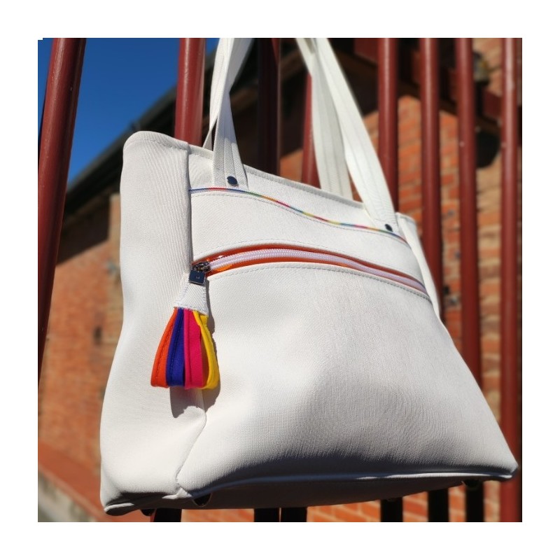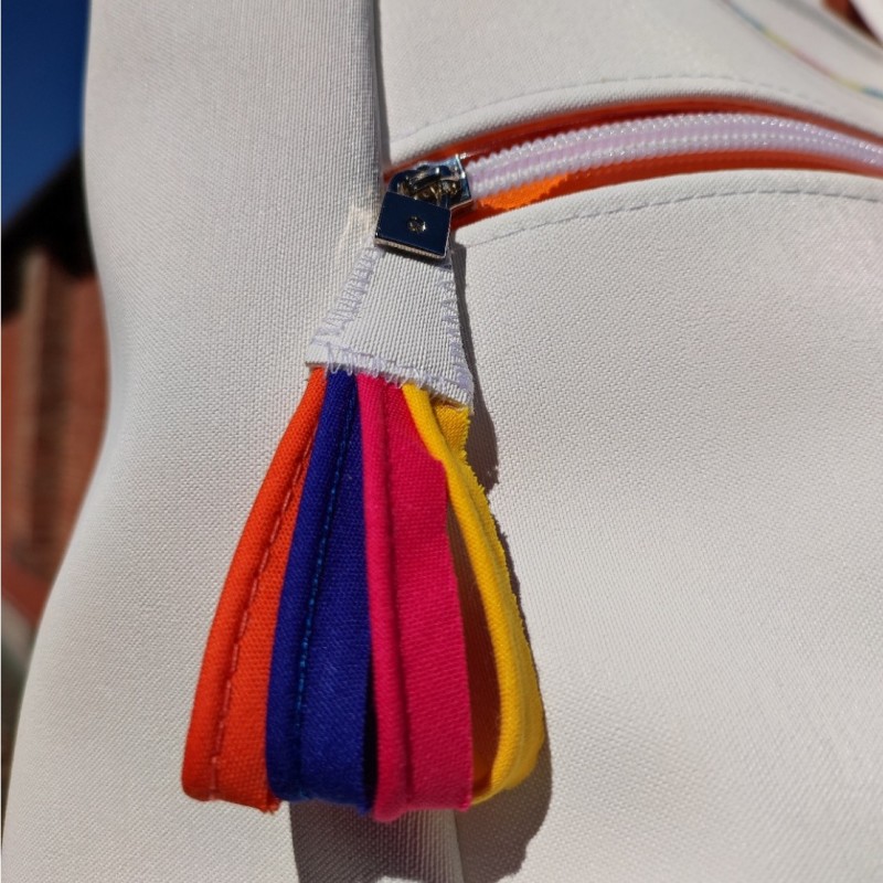 Il est réalisé en Beach blanche et la poche plaquée en passepoil mèche polycoton (fuchsia, jaune, violet, bleu roi, orange et rouge)