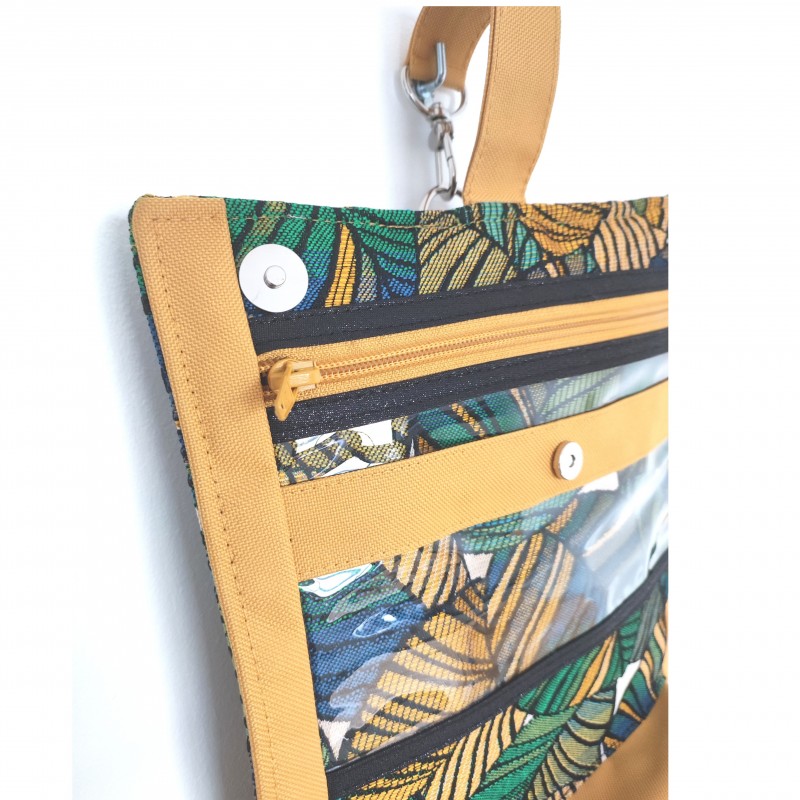 Elle est réalisée en jacquard Mazakuba émeraude (hors collection) et toile à sac moutarde.