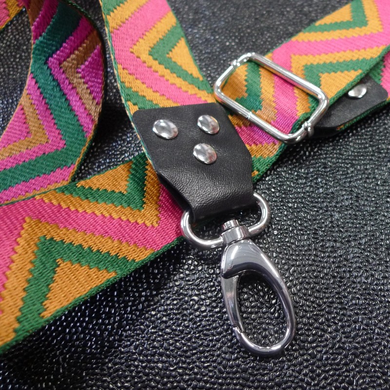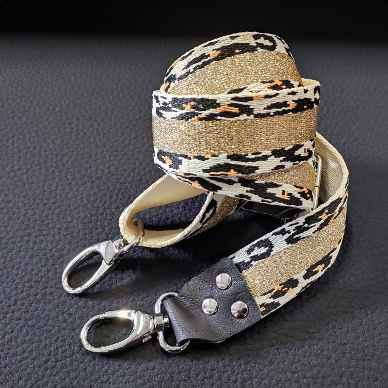En exemple des réducteurs noirs et marron montés sur une sangle fantaisie pour créer sa bandoulière sur mesure