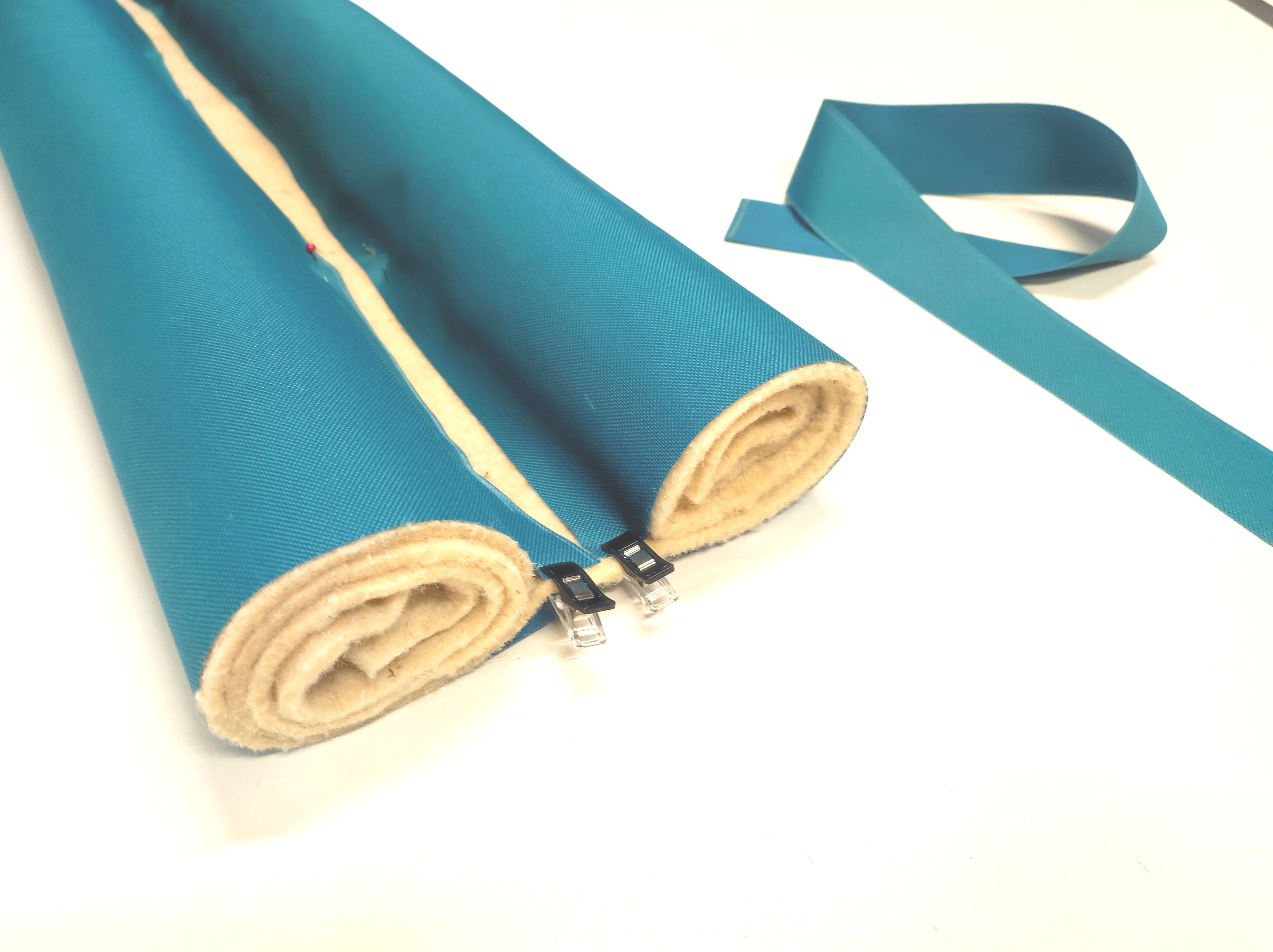 4- Mettre du Wonder tape au centre envers de la bande de toile à sac restante. Plaquez sur la partie plate entre les 2 boudins formés.