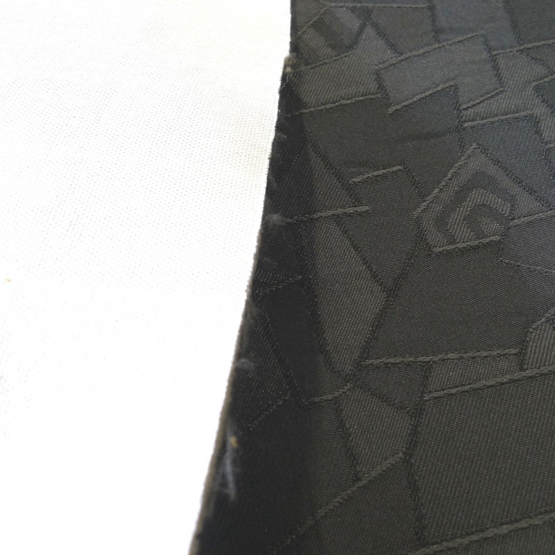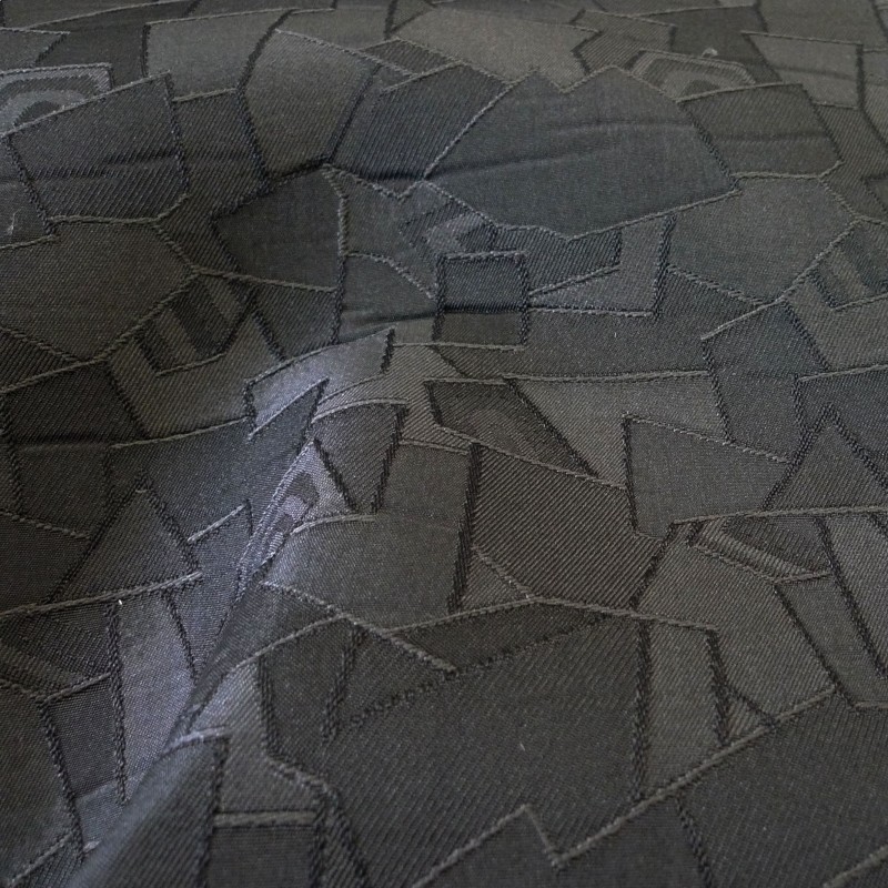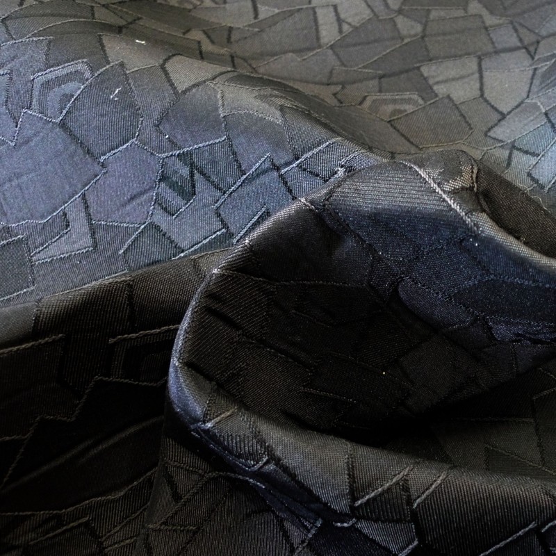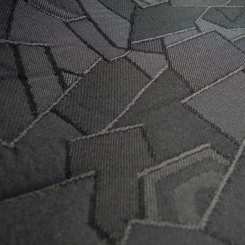 Nous sommes totalement sous le charme de cette matière originale qui joue sur le tissage et sur les reflets du noir : parfois noir, parfois bleuté et de toute façon un très subtil anthracite.