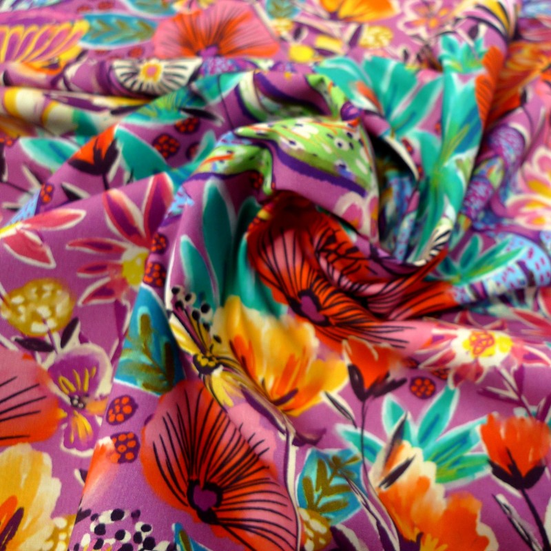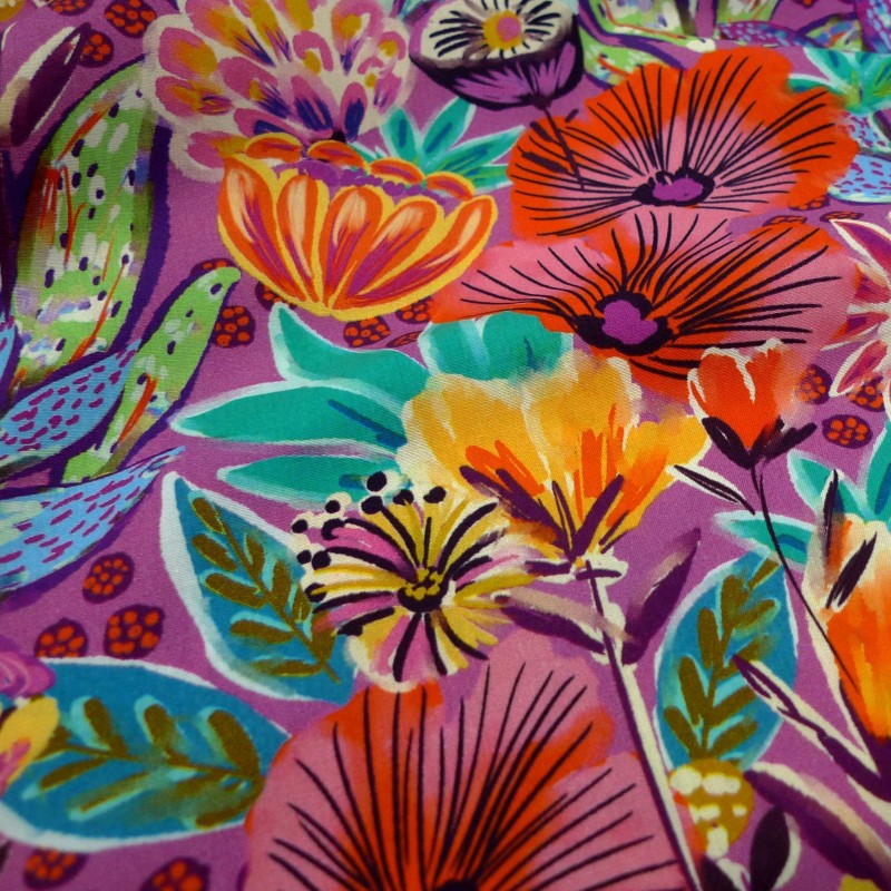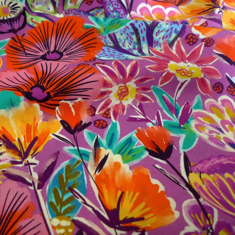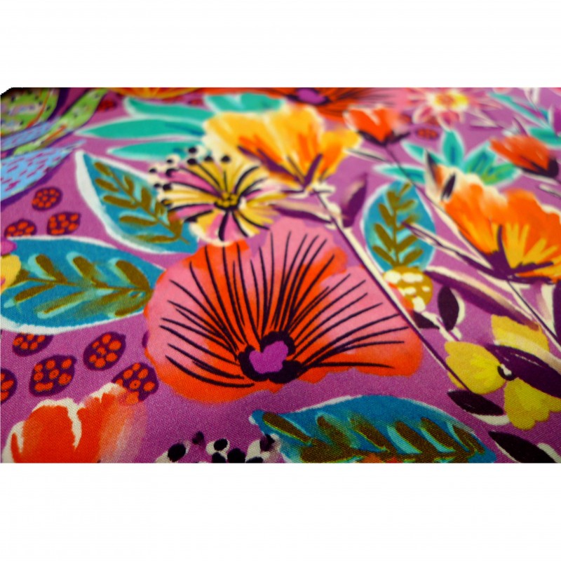 Couleurs : Fond prune motifs : rose girly, rose, jaune, vert, turquoise, bleu, orange, blanc